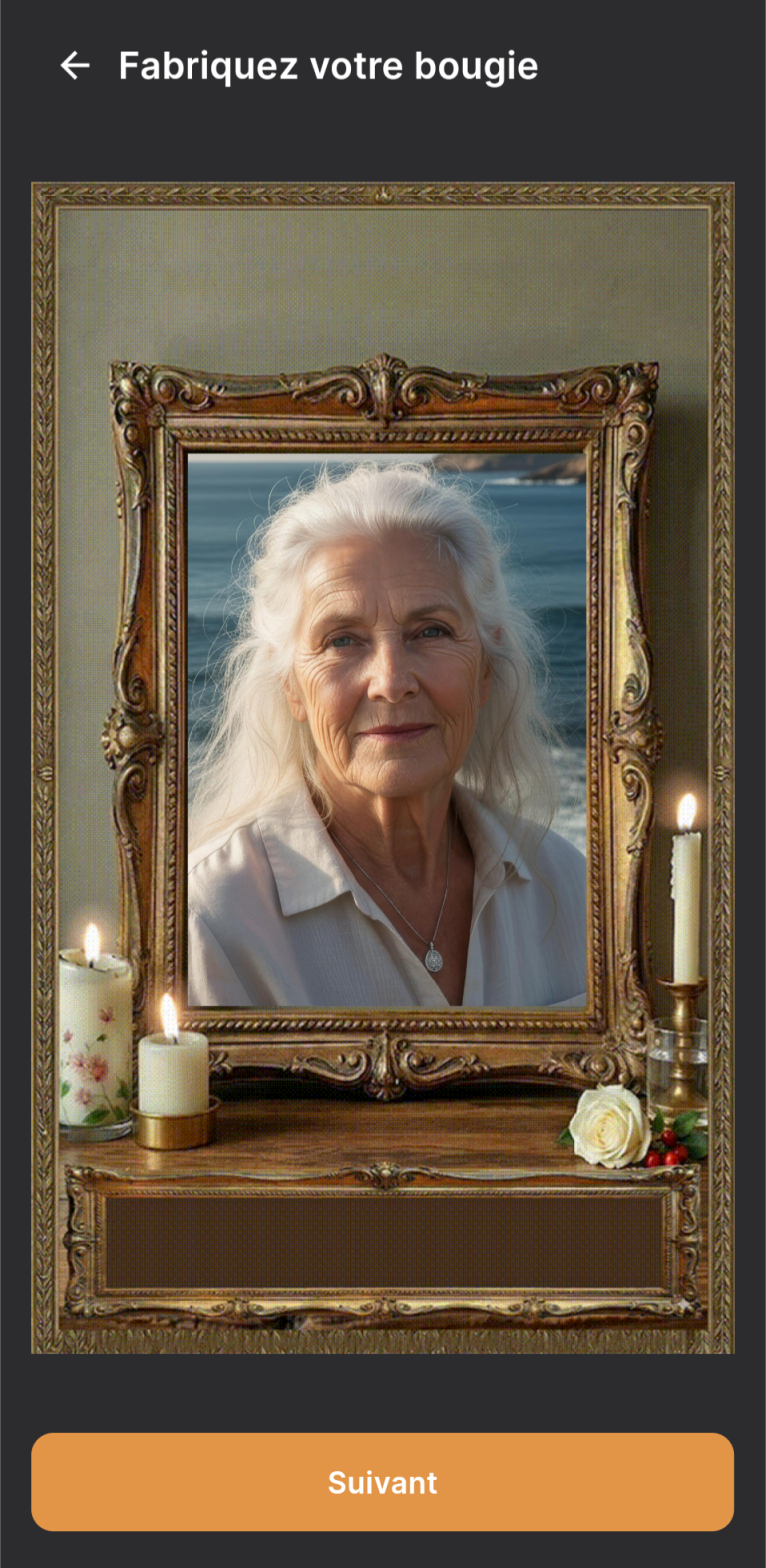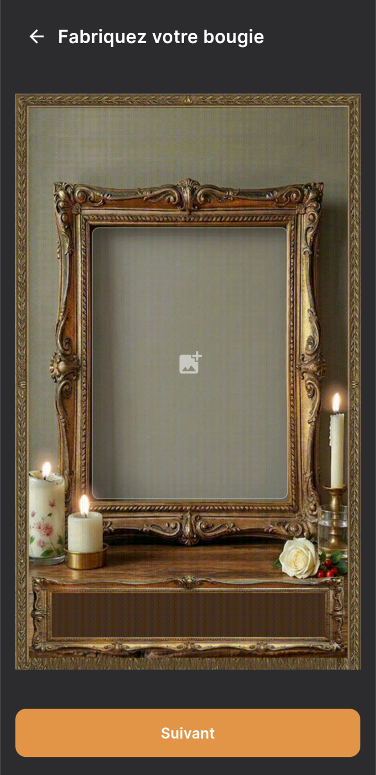 Une fois votre bougie choisie, toucez le centre du cadre. Votre navigateur de photo va s'ouvrir et vous pourrez choisir la photo voulue. Celle-ci va s'accicher en entier dans le cadre, vous pourrez la redimentionner avec deux doigts en pinçant pour zoomer et la recentrer en glissant votre doigt dessus.